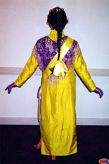 Original creation. The CPC Pageant Girl costume consists of a purple satin lined yellow 100% silk cheongsam with three sequin frog closures and side slits to hip. Accessories include a rhinestone tiara, purple sequin & beaded shawl, custom satin sash & ribbon, hand dyed purple lace gloves, beaded shoes and hand dyed raffia handbag.
