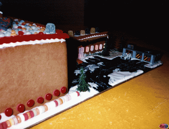 Gingerbread sculpture, with plastic toys. Cake icing and various candy decoration.