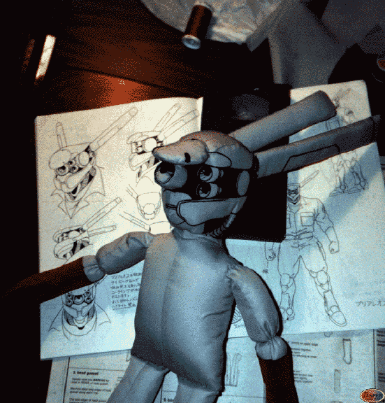 Kimberly and I planned to attend our first anime convention, AnimeExpo 1993, in costume. At the time I was too busy with work at the good guys! to construct a costume this complex for Kimberly, so she commissioned the costume to be assembled by Amy M. Schneider. I designed and patterned the costume using the single illustration on page #37 of "Intron Depot 1". Kimberly deliberately selected an obscure version of Deunan, instead of her overly done military fatigues. She wanted to use high-end fabrics for this costume, so we purchased ultra-suede and real silk. To compliment her costume, I made an SD Briareos doll. Sadly, the costume was neither recognized nor well-received at the time, because not many American fans had access to much of Shirow's original works. Since it was not from the "anime", we guess unfamiliar costumes go over some people's heads. To further complicate matters, the lights were turned off during Kimberly walk-through at the AX93 Masquerade, so no one could actually see her costume and the effort put into this beautiful costume.