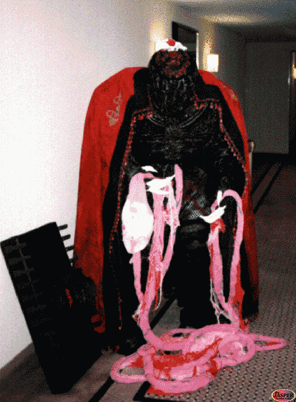 Kimberly and I decided to join forces and perform Z-RAM Bytes the Dust in 1997. This would be an unusual and daring performance, combining two characters from completely different series (yes, a cross-over skit). A sweet, innocent schoolgirl fighting a big, evil monster. Okay, we've heard this one before, BUT we wanted to twist this tale. As Eméril would say: Kick it up a notch... We decided that Hikaru would find the strength to decapitate and disembowel her opponent, without a sword. She was on a quest.... searching for her little marshmallow, Mokona - who was munched up by Z-RAM. Remember the tale of Peter and the Wolf? Mokona was tucked away somewhere in 60-feet of Pepto pink intestines, tightly wound up in Z-RAMs chest cavity.
